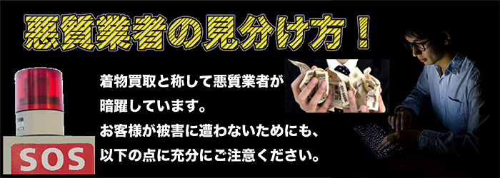 『しっかり説明、しっかり返品いたします』 買取した着物は売買契約しても7日間以内なら返品に応じなければならないという、「クーリングオフ契約」が法律で定められています。 つまり、「一旦契約したけど、やっぱり売りたくなくなったから返してほしい!」といえば、業者は返品しなければならないという法律です。 しかし、悪質業者は返品したくないため、また面倒な事態を避けるために、クーリングオフが出来ない契約だと嘘を言ったり、説明をしないなど、お客様をダマし、説得しようとしますので、注意してください。 | |
